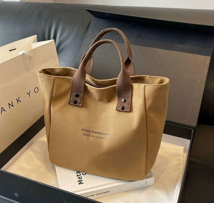 Made with durable canvas and accented with coffee-brown handles for a warm, earthy vibe.